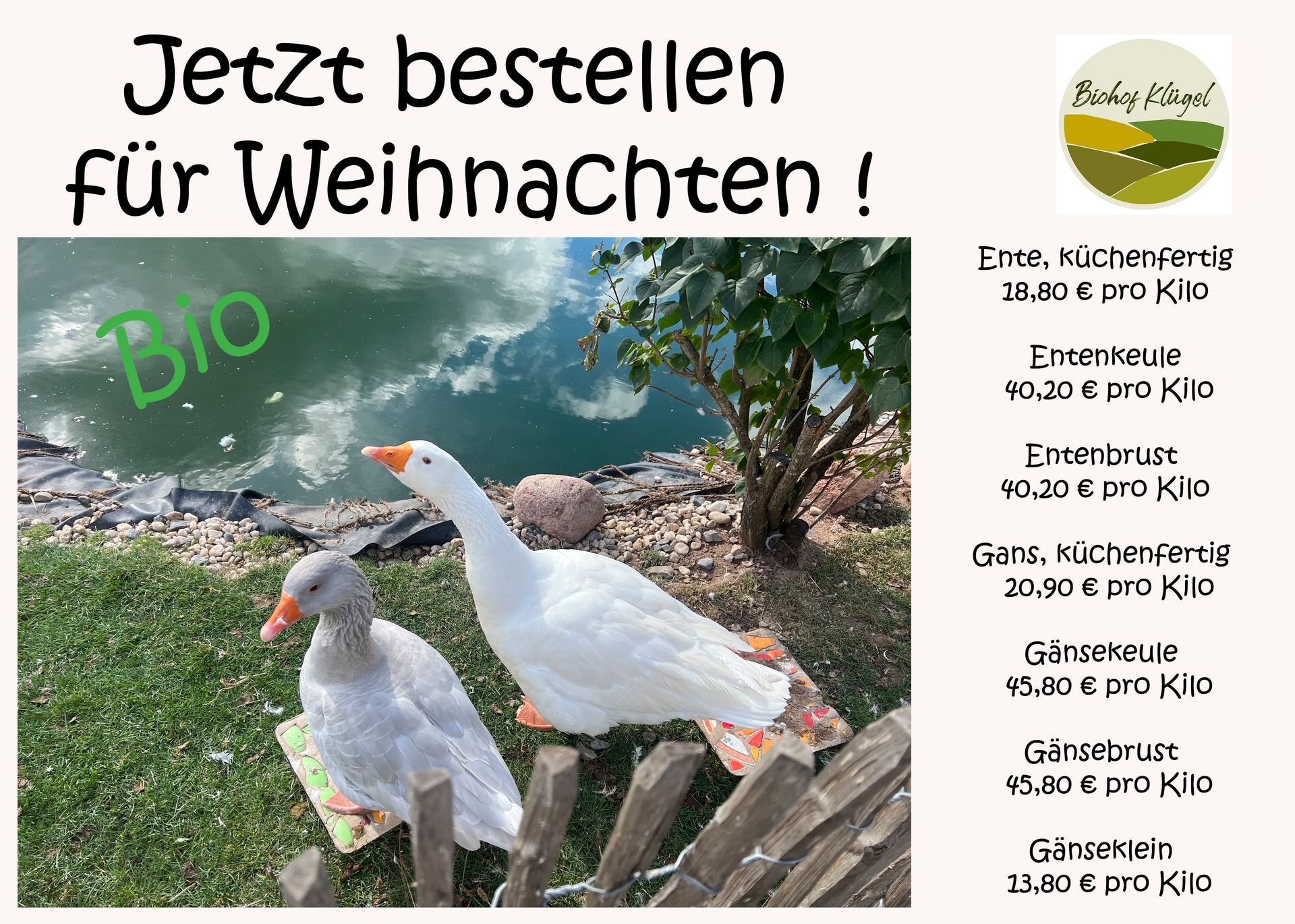 Noch bis 1. Dezember nehmen wir Bestellungen für BIO-Gänse und -Enten in unserem Hofladen entgegen.