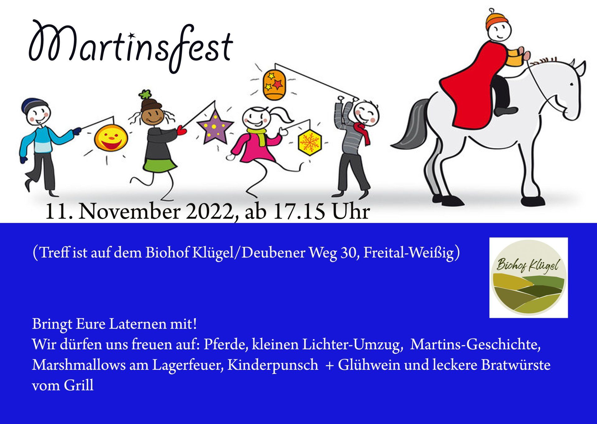 Am 15. November 2025 findet wieder unser alljährliches Martinsfest statt. Ab 16 Uhr gibt es Kinderpunsch, Glühwein und Bratwurst vom Grill. Gegen 17 Uhr startet der Martinsumzug, begleitet vom heiligen Martin auf dem Pferd mit seinem Gefolge. Im Anschluss wird die Geschichte vom heiligen Martin am Lagerfeuer erzählt. Dazu gibt es Knüppelkuchen für die Kinder.