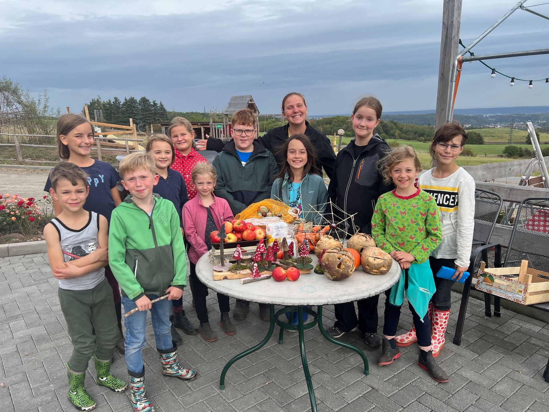 Es dreht sich in diesen zwei Ferienwochen alles um die farbenfreudigste Jahreszeit - den Herbst. Wir druckten Memory mit Blättern, bauten Futterstationen aus Holz, legten Mandalas aus Früchten des Waldes, klebten und bemalten Pilze aus Eierschachteln, schnitzen Rübengesichter, feierten Erntedank und wanderten mit Ziege Jule und Shetty Filou durch unseren Weißiger Wald. Die Pferdefreunde kamen natürlich auch auf ihre Kosten, bei Pferdewanderungen, Pferdespielen und Wellness für die Vierbeiner.